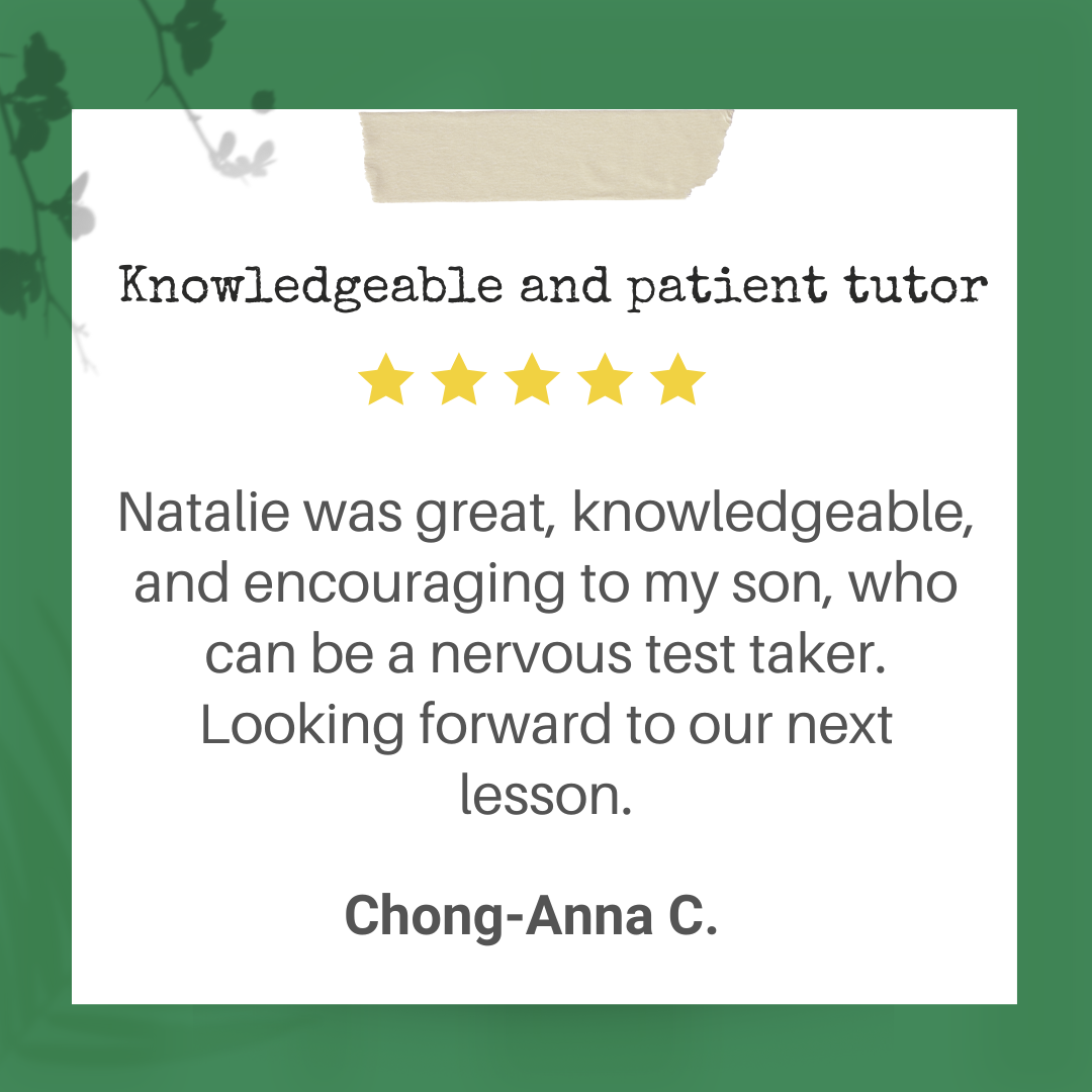 I offer one-on-one lessons, not classes, where my tutoring adapts to the needs of every student. I guide students through their test prep with targeted concept review, strategies, and time management techniques. I do not have a one-size-fits-all approach or set curriculum for everyone to follow.