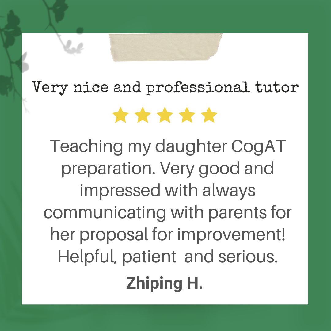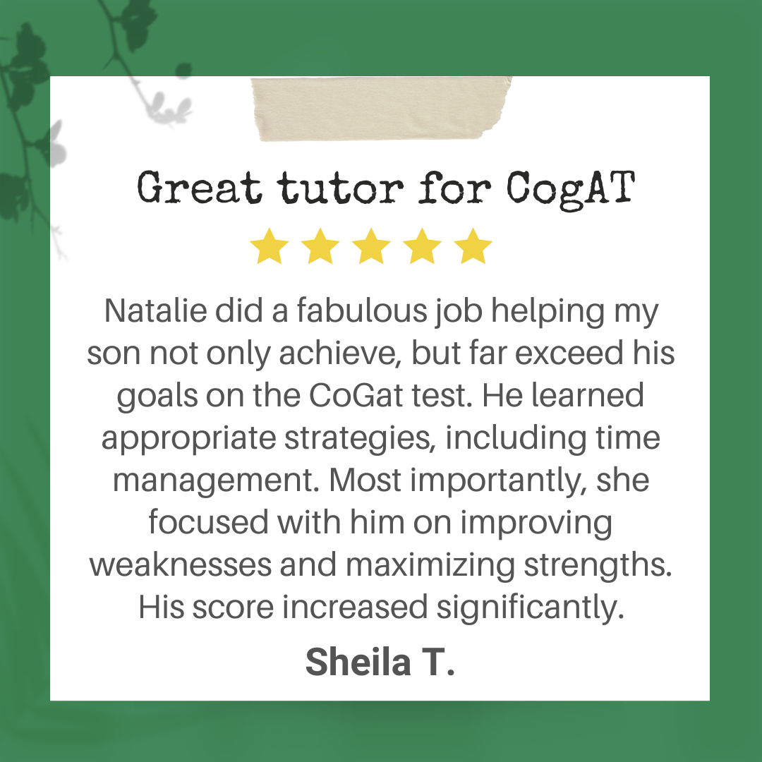 With so much to focus on for CogAT test prep, you need CogAT tutoring you can rely on. Natalie’s CogAT tutoring services includes complete test preparations for all 9 sub-sections. She works with children in grades 2-12, and her students are top scorers. She combine practice and strategies to help them find the right answers the first time. They also do vocabulary study, math review, and figure/shape activities to help them build on their concept knowledge and time management. Every child who has worked with her has scored in the 90th percentile or higher.