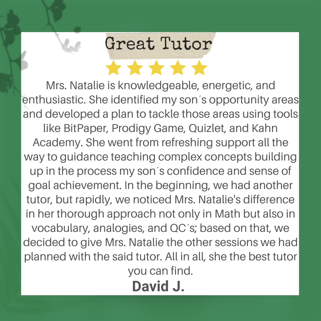 I offer one-on-one lessons, not classes, where my tutoring adapts to the needs of every student. I guide students through their test prep with targeted concept review, strategies, and time management techniques. I do not have a one-size-fits-all approach or set curriculum for everyone to follow.