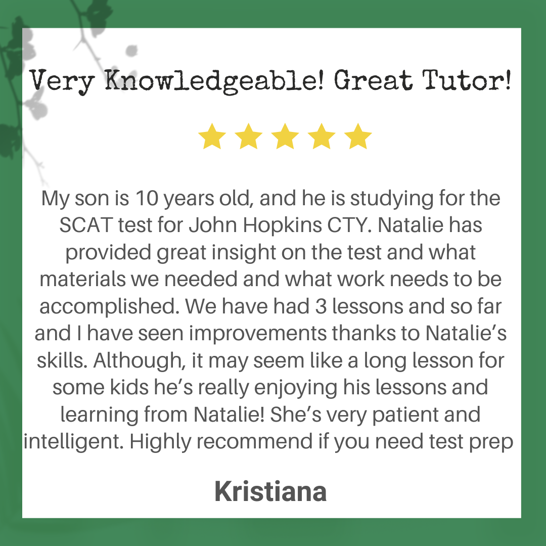 Natalie’s SCAT tutoring includes complete test preparation for both sections in the Elementary (grades 2-3), Intermediate (grades 4-5) and Advanced (grades 6+) levels of the SCAT. The SCAT is a unique test designed by CTY (John Hopkins Center for Talented Youth). Students in grades 2-12 can take the 40-minute test to get into advanced online programs. It has 2 sections, verbal and quantitative, and each section is 50 questions long with a 20-minute time limit. Natalie’s students score in the top percentiles so they can pass the test or achieve High/Grand Honors status, based on their goals.