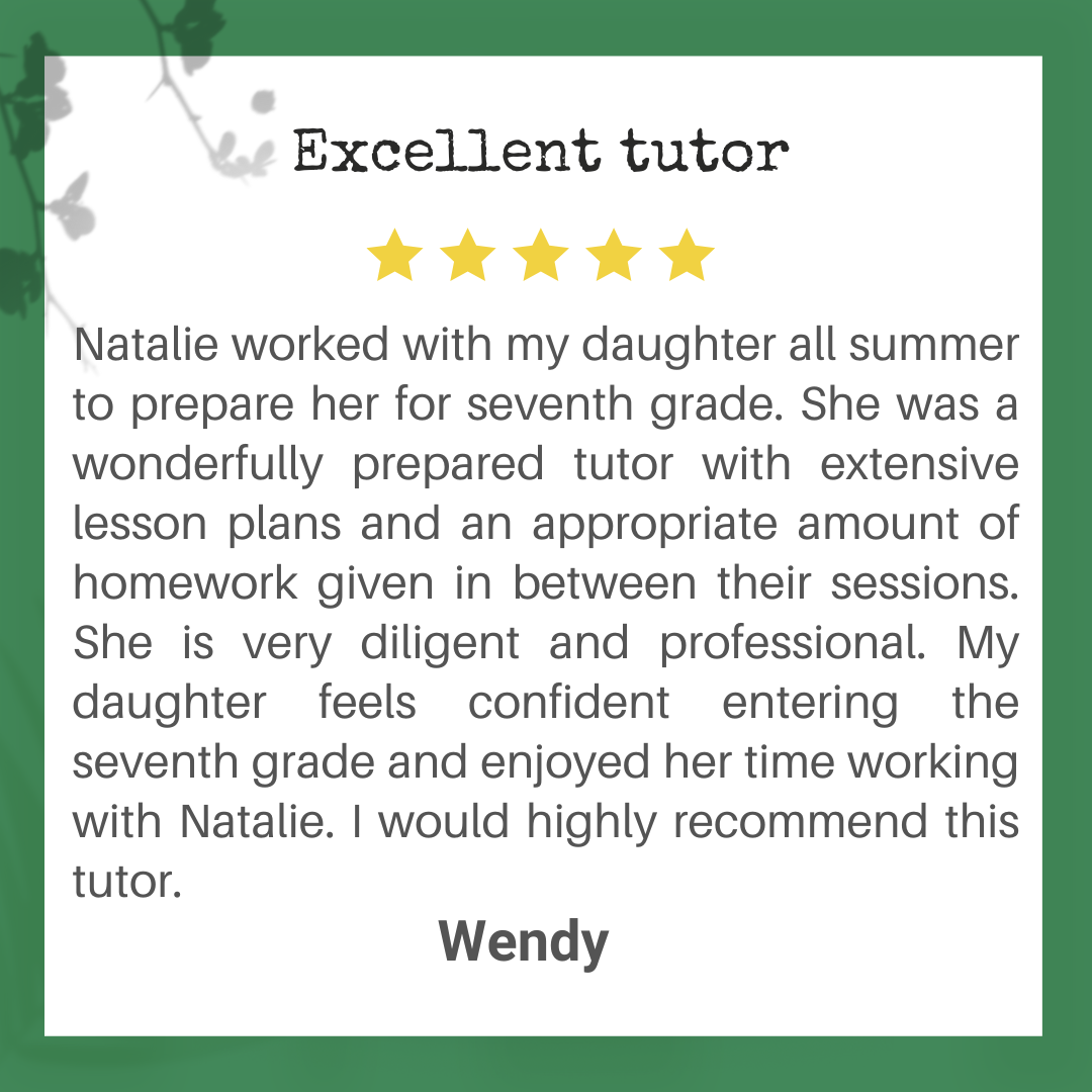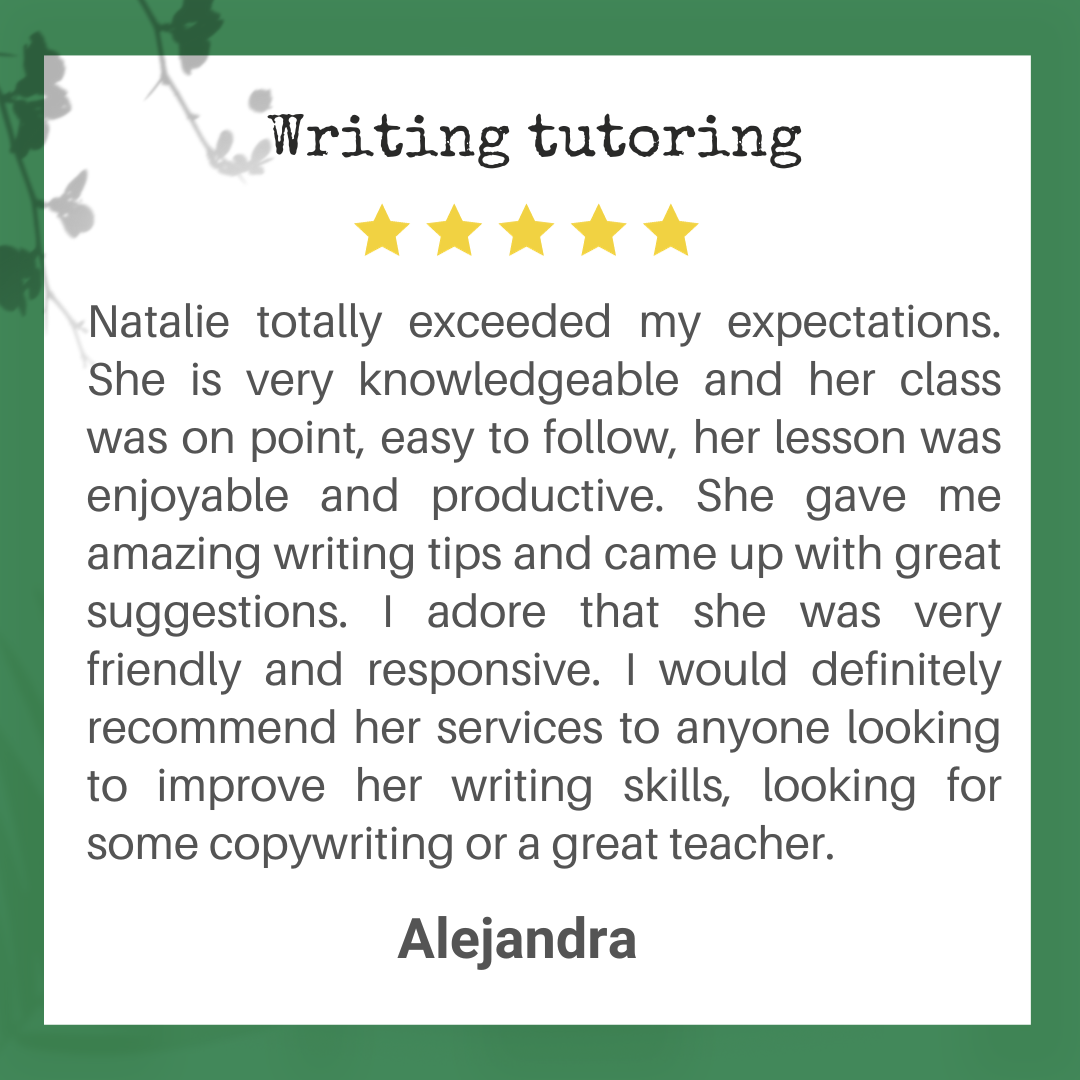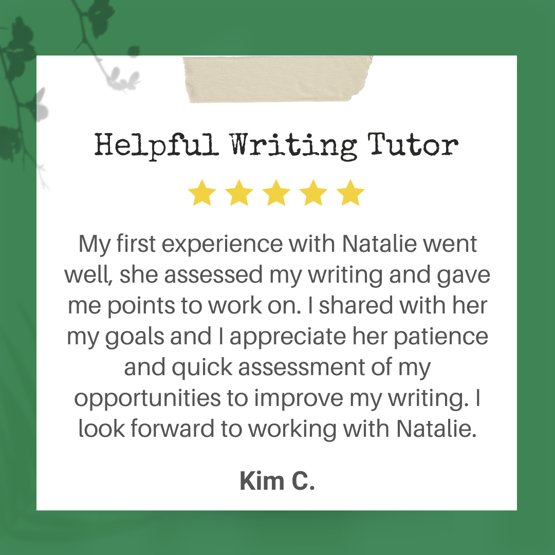 Natalie has been working as a professional writer and editor since 2009, and she started to tutor writing in 2010. Writing tutoring is how she has helped hundreds of students become assertive, enthusiastic writers. Every person in the world has the potential to be a confident, eloquent writer. All it takes is one step โ or sentence โ forward in the right direction. As your child’s writing tutor, she provides the best support for your child on the path to successful writing.