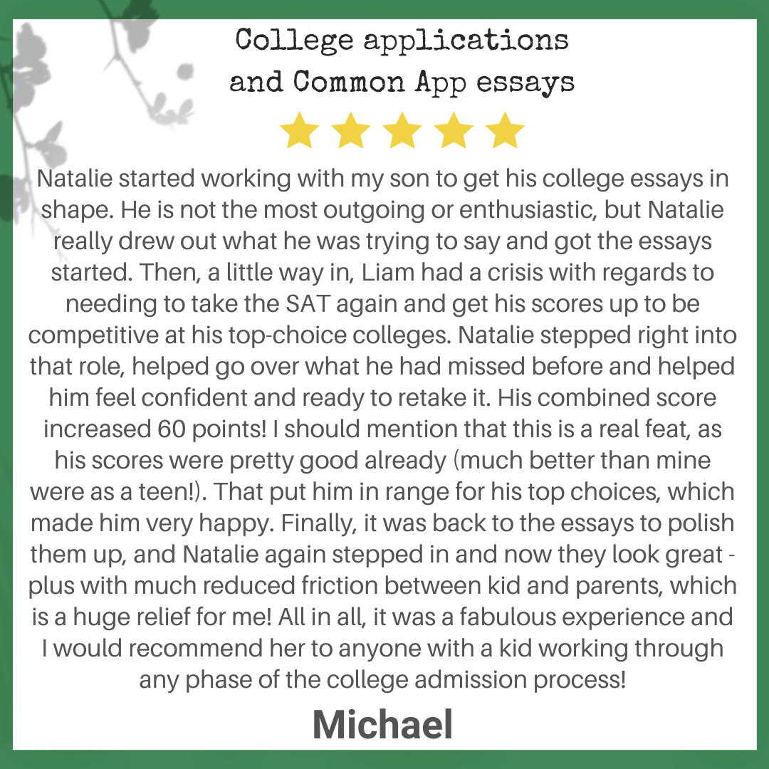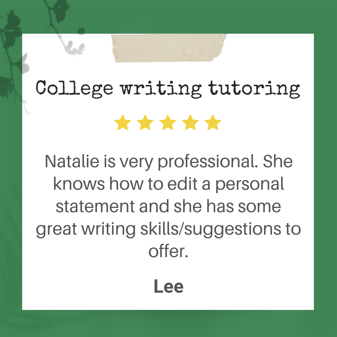 As a professional writer and editor since 2009, Natalie has helped many high school students polish their college application essays, coaching them through college application questions that require short but powerful responses. She works with your child within the guidelines of every application process. Together, we craft a personal, meaningful presentation of skills and accomplishments so they can be accepted to the college or university of their choice!